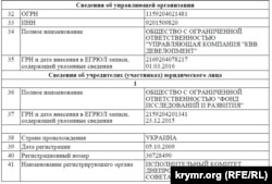 Более интересен перечень владельцев ООО «Карбон проект», зарегистрированного в российском реестре в ноябре 2014 года. Предприятие занимается топографо-геодезической деятельностью, электромонтажными работами, землеустройством, покупкой и продажей земельных участков. Учреждено севастопольским ООО «Стройпроминвест», которым, в свою очередь, владеют Василий Казьмин (возможно, отец арестованного бизнесмена) и принадлежащее ему ООО «Фонд исследований и развития», зарегистрированное в декабре прошлого года на материковой Украине с юридическим адресом в Киеве.