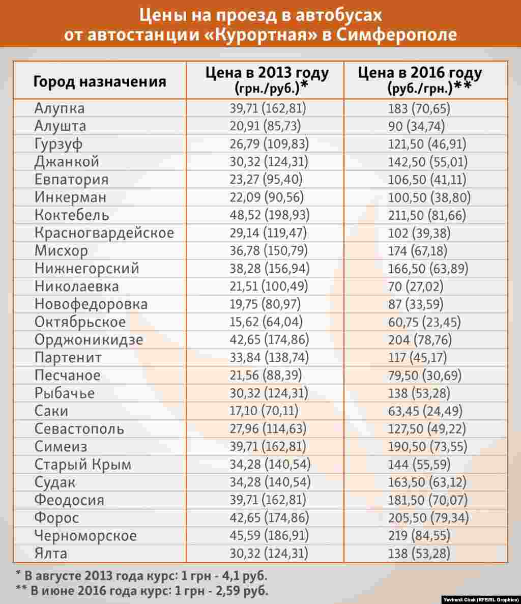 Спустя более двух лет с момента аннексии Крыма, цены на проезд в междугородних автобусах существенно изменились. Сравнительные данные о стоимости проезда от автостанции «Курортная» в Симферополе приведены в визуализации.