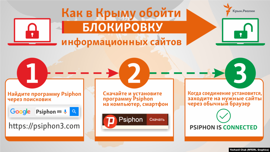 Не удается получить доступ к сайту Крым.Реалии? Подозреваете, что сайт заблокировали? Инструкция как обойти блокировку: скачайте и установите программу Psiphon через поисковик. Когда соединение установится, заходите на нужные сайты через обычный браузер.