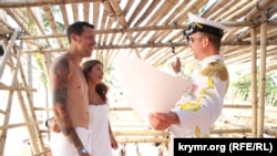 Среди посетителей не случайно так много пар в ярких нарядах. Сегодня на KaZантип-е день свадеб. Любым желающим предлагается узаконить отношения, и их союз будет считаться официальным на фестивальной территории.
