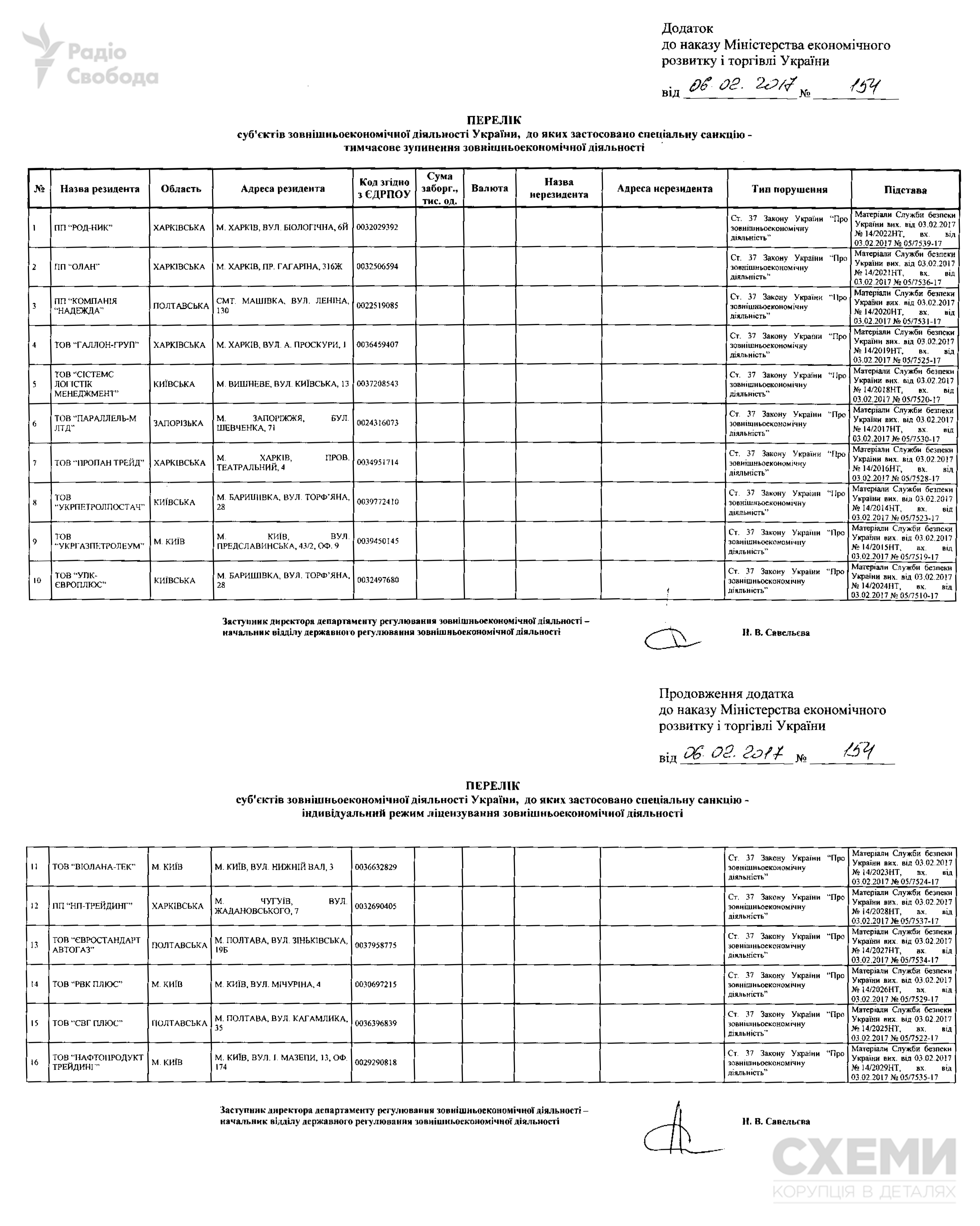 6 февраля Министерство экономического развития и торговли по требованию СБУ издало приказ, согласно которому, против 16 компаний-импортеров нефтепродуктов введены специальные санкции – запрет внешнеэкономической деятельности. Причина санкций та же – уголовное производство по статье 285-5 («финансирование терроризма»). На компании, против которых введены санкции, приходится 40% импорта сжиженного газа в 2016 году.