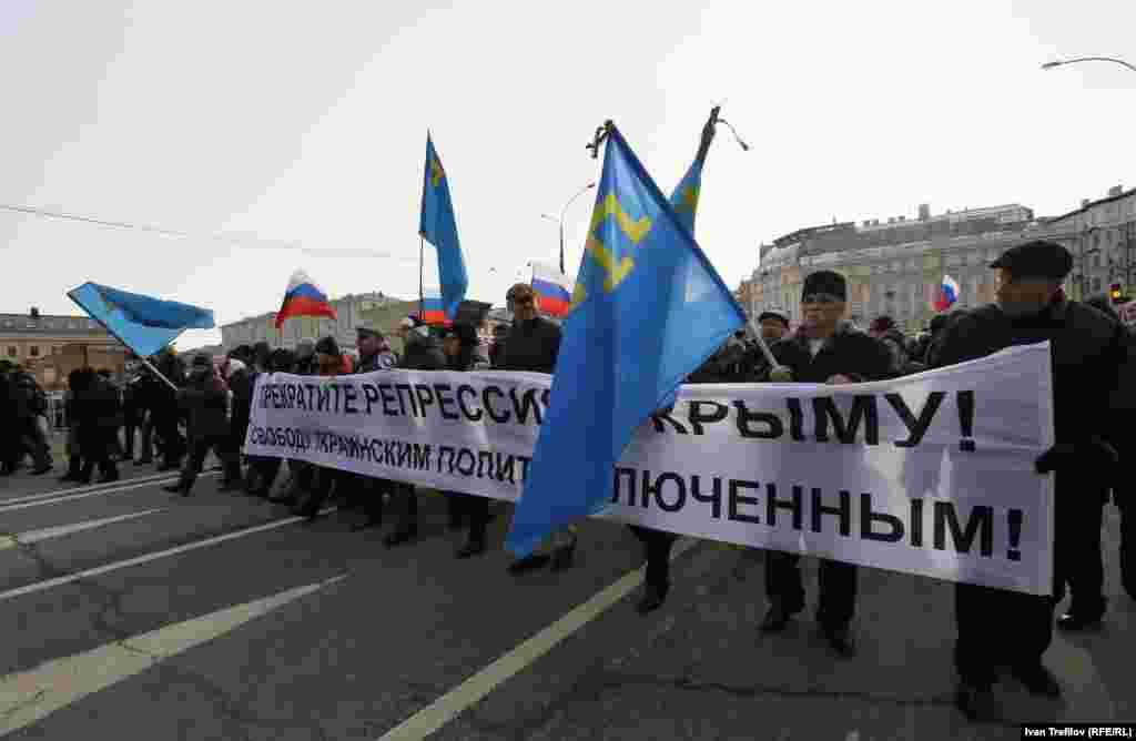 В Москве в рамках «Марша Бориса Немцова» прошла колонна в поддержку украинских политзаключенных и против репрессий в Крыму. «У нас была своя колонна, со своей растяжкой. К нашей колонне под крымскотатарскими флагами присоединилось довольно большое количество людей уже отсюда, из Москвы. Из Крыма нас приехало всего несколько активистов», – рассказала Крым.Реалии дочь зампредседателя Меджлиса Ильми Умерова Айше. Российский адвокат Марк Фейгин на своей странице в Твиттере написал, что растяжку «Прекратите репрессии в Крыму! Свободу украинским политзаключенным!» отправили в Крым.