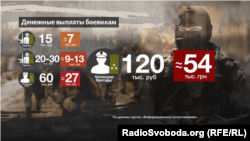 Платят боевикам в группировках «ДНР» и «ЛНР» в рублях. «Рядовому» – 15 тысяч в месяц. Это около 7 тысяч гривен. «Сержанты», в пересчете на гривны, получают до 13 тысяч. «Командир роты», по данным «Информационного сопротивления», – 27 тысяч, «командир бригады» – более 50 тысяч гривен в месяц.