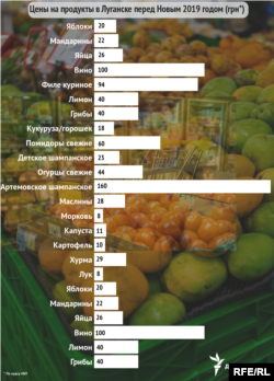 На новогодний стол семья из трех человек планирует потратить 1000 рублей (400 грн.). Будут готовить «оливье», салат «Мимозу», картошку, небольшую курочку и окрошку. При этом – 40-50% продуктов к Новому году, по их словам, им привезли родственники из подконтрольной Украине территории.