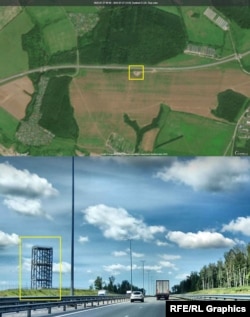Следующую построенную совсем недавно башню для "Панциря" автомобилисты могут увидеть на этой же трассе в 8 километрах севернее. Ее тоже начали строить в июне и закончили не позднее 7 июля, самого "Панциря" на башне также пока нет. Эта позиция ПВО расположена ровно посередине между двумя бывшими советскими базами, на которых были дислоцированы ракетные комплексы С-25 "Беркут".
