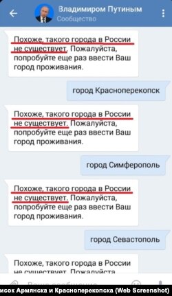 Крымчанка Нина Коробко, которая пыталась пожаловаться Владимиру Путину на кислотные выбросы «Крымского титана», столкнулась с тем, что мобильное приложение «Москва – Путину», принимающее вопросы для «прямой линии», не распознало Красноперекопск как город в России. Такая же ситуация – и с другими городами Крыма.