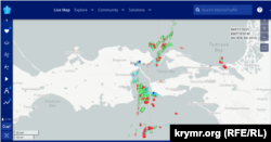 На скриншоте видно, что группа кораблей с одной стороны собралась в районе села Заветное в Крыму и Волна в России. С противоположной стороны суда стоят в районе коса Чушка.