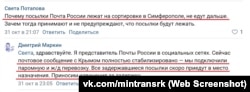 Жительница Симферополя Светлана Потапова на странице Сергея Аксенова поинтересовались, «почему посылки «Почты России» лежат на сортировке в Симферополе и не едут дальше». Представитель почтового оператора пояснил, что это связано с логистикой и пообещал, что «все задержавшиеся посылки скоро приедут в место назначения».
