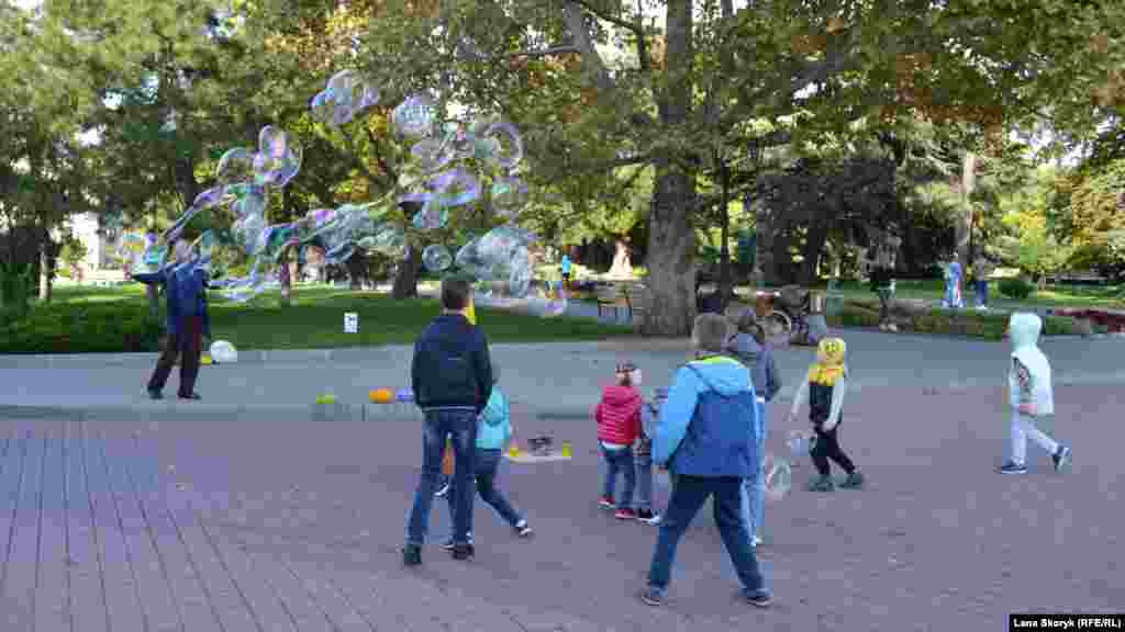 В выходные дни в Севастополе установилась теплая погода, столбик термометра днем поднялся до отметки +18 градусов. Многие севастопольцы и гости города вышли на Приморский бульвар прогуляться и подышать свежим воздухом морского бриза. У Дворца детства и юности аниматор-любитель развлекал ребятишек, выдувая огромные мыльные пузыри.