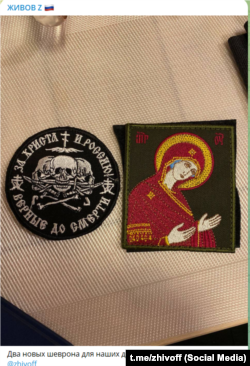 Российский блогер Алексей Живов, позиционирующий себя как политолог, разработал свои патчи. Он любит шевроны на христианскую тематику. Живов переехал из Москвы в Крым и часто ездит на позиции к российским военным как волонтер. Дарит им шевроны для «ускоренной христианизации русской армии». Вместе с автором телеграм-канала «Заставный» разработал вот такой шеврон с тремя черепами.