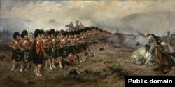 «Русские слева от них на мгновение перевели дыхание, и затем одной большой линией ринулись на горцев. Земля летела под копытами их лошадей; набирая скорость с каждым шагом, они бросились на эту тонкую красную полоску, увенчанную стальной линией. Когда русские приближаются на шестьсот ярдов, вниз опускается эта передняя стальная линия, и из колец вырывается залп огня… Затаив от напряжения дыхание, каждый ждет прорыва этой волной линии гаэльской скалы; но прежде чем они приблизились на сто пятьдесят ярдов, еще одним смертельным залпом вспыхивают выровненные винтовки и несут русским смерть и ужас».