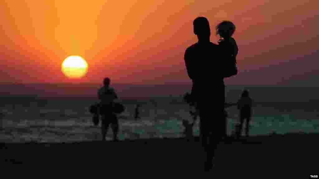 Отдыхающие вместе с детьми собрались на пляже в селе Поповка (Сакский район), чтобы посмотреть как за горизонт заходит солнце.
