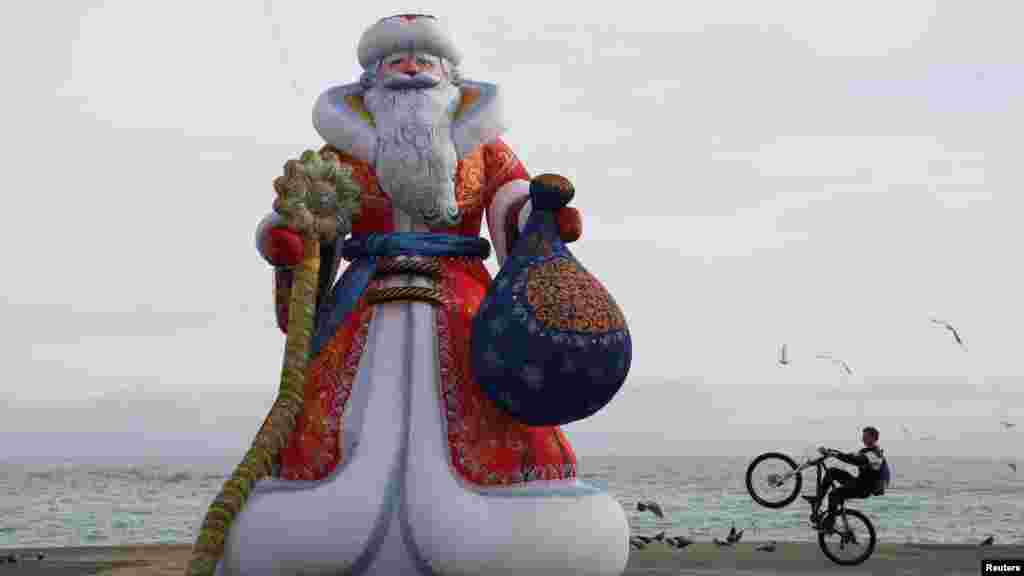 Велосипедист выполняет трюк на набережной в Алуште возле надувной фигуры Деда Мороза.