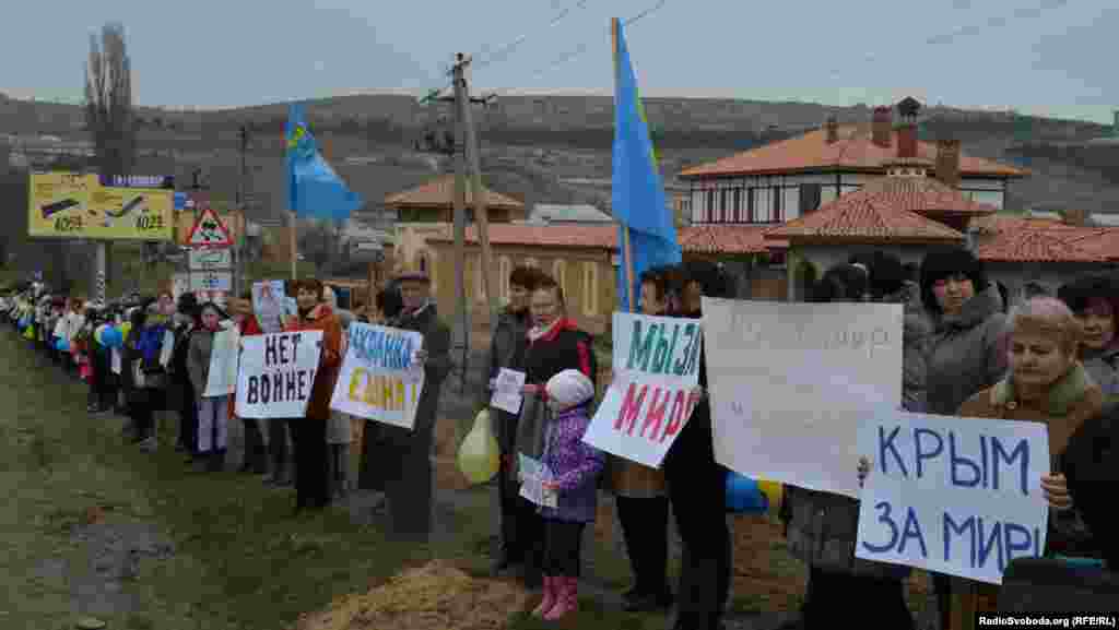 В почти тысяче населенных пунктах во всех районах Крымского полуострова, на тот момент уже почти оккупированному российскими войсками, женщины создали сотни живых цепочек вдоль крымских дорог и автотрасс с украинскими и крымскотатарскими флагами и лозунгами за мир и целостность Украины.