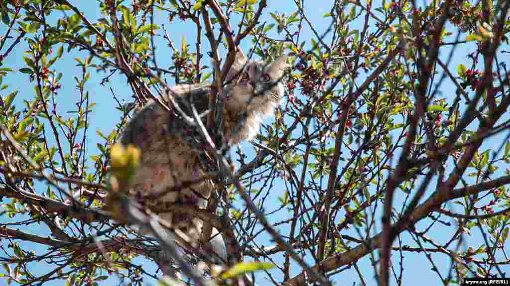 Севастополь. Микрорайон «Остряки». Кошка из частного дома на проспекте Генерала Острякова устроила охоту на птиц, оккупировавших персиковое дерево. Охота закончилась ничем – птицы, увидев кошку, разлетелись, домашняя хищница продолжила прогулку без добычи.