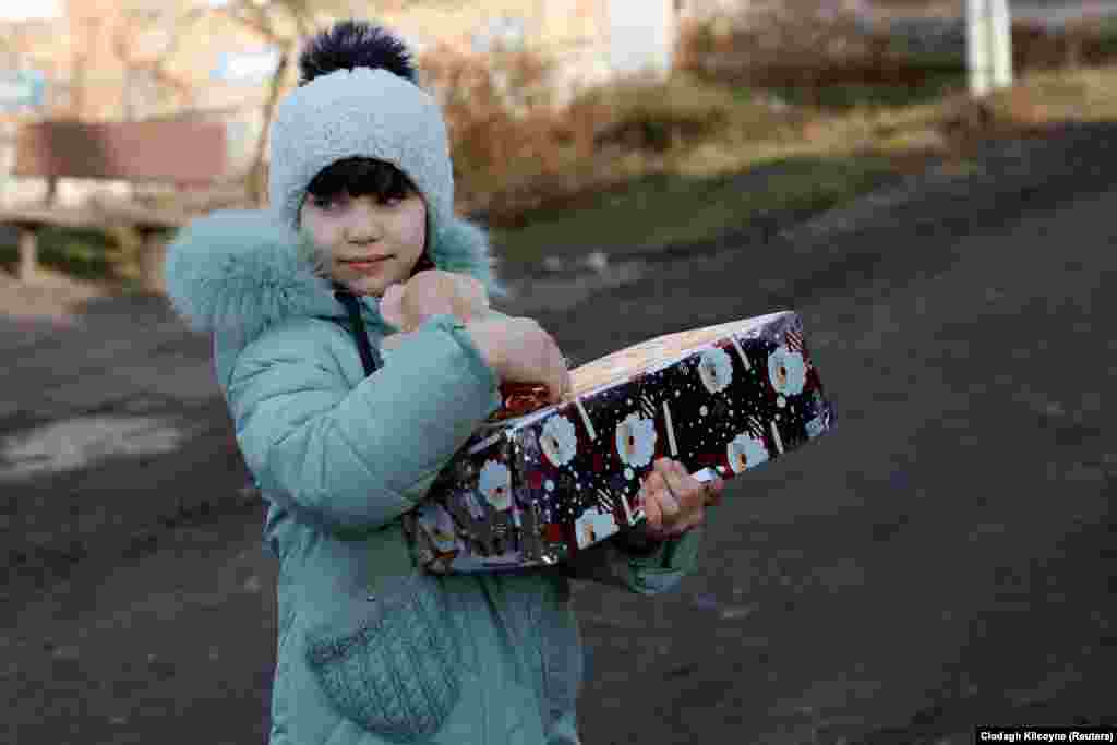 Трехлетняя Саша ждет у дверей своего дома фургон с подарками в преддверии православного Рождества в Бахмуте, Донецкая область Украины.