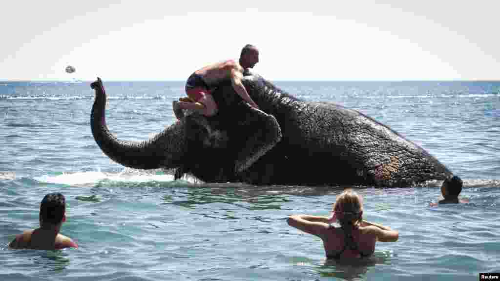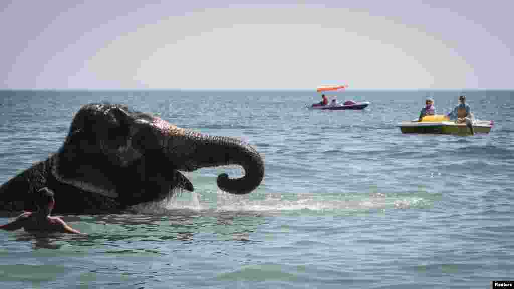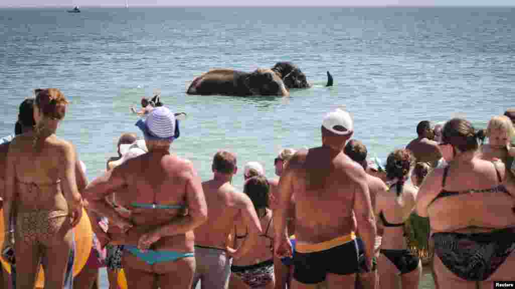 Необычные туристы в Евпатории: слоны купаются в море (фотогалерея)