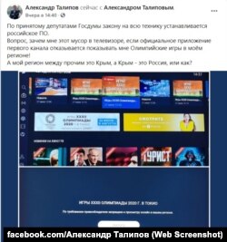 «По принятому депутатами Госдумы (России – КР) закону на всю технику устанавливается российское программное обеспечение. Вопрос: зачем мне этот мусор в телевизоре, если официальное приложение «Первого канала» отказывается показывать мне Олимпийские игры в моем регионе! А мой регион, между прочим, – это Крым, а Крым – это Россия, или как?», – пишет он в соцсетях.