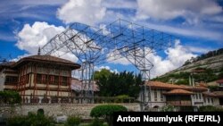 «Уже смонтированная конструкция, там будет купол, который позволит разобрать крышу, для того чтобы снять нагрузку и проводить в дальнейшем уже именно реставрационные работы», – рассказывает для СМИ руководитель подконтрольной Кремлю администрации Бахчисарая Александр Трянов.