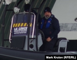 Съемочная группа Радио Свобода приехала в Каррару 24 января, предварительно договорившись об аренде небольшой лодки в марине. Когда мы подходили к пирсу, на "Шехерезаде" все было спокойно – на палубе было лишь несколько человек. Как только мы отплыли и стали проплывать вдоль левого борта яхты, ситуация кардинальным образом изменилась.