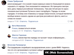 Как пишет Роман Трибунский: «Меня возмущает что в моей стране важные новости. Оказывается, можно скрывать от народа. Они оказывается, неважные. Из принципа смотрю весь день первые российские телеканалы. Там уже пятый раз по кругу показали выступление Путина в Санкт-Петербурге. Парады по всем городам. А почему они отменены в городе Севастополе, который является вообще, можно сказать, одним из центров российского флота, никто и слова не сказал».