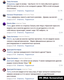 Пользователь Марина Шеина сомневается, что дрон прилетел с материковой части Украины: «... с территории Крыма запустили. Не верю, что через весь полуостров или море беспилотник пролетел незамеченным». Другие участники группы в ответах на ее комментарий тоже не сомневаются в этом. «Понятно, что с территории самого города», – пишет Юрий Переверзев.
