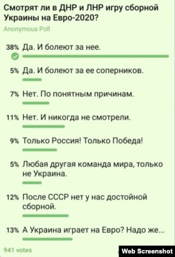 Сборная Украины в первом матче европейского чемпионата по футболу сыграла против Нидерландов 2:3, а Россия стартовала со счетом 0:3 против Бельгии. Как эти матчи смотрят на оккупированной российскими гибридными силами части востока Украины? За кого болеют в Донецке, принимавшем Европервенство в 2012-м? Об этом пишет проект Радiо Свобода «Донбасс Реалии».